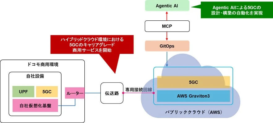 さらに、ドコモ、NTTドコモビジネス株式会社、NTTドコモソリューションズ株式会社は、世界で初めて、AIと「GitOps」と呼ばれる運用自動化手法を組み合わせた「Agentic AI」を活用し、5Gコアネットワークの設計から構築までの自動化に成功しました。この革新的な技術により、従来に比べて構築期間を約80%短縮し、人為ミスを防ぐことが可能になります。