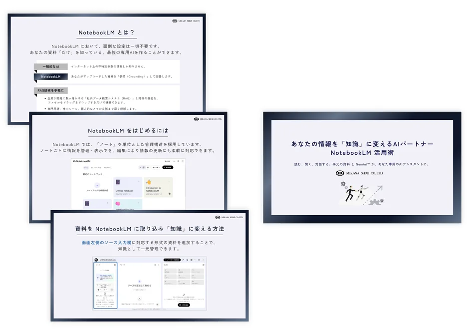 ミカサ商事が公開した解説資料『あなたの情報を「知識」に変えるAIパートナー NotebookLM 活用術』は、NotebookLMの理解を深めるだけでなく、生成AI全般の知識を広げる上でも非常に有効な一冊です。ぜひこの機会に資料をダウンロードし、NotebookLMがもたらす新たな知識活用の世界を体験してみてください。