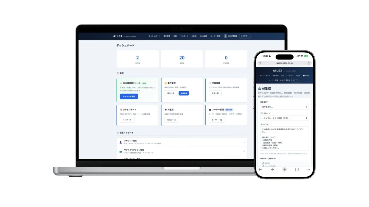 2026年2月12日、AILEX合同会社(本社:東京都渋谷区)は、1人・小~中規模法律事務所向けAI SaaS「AILEX(エーアイレックス)」の正式リリースを発表しました。同時に、弁護士法人えそら(東京都千代田区)が顧問弁護士事務所に就任しています。