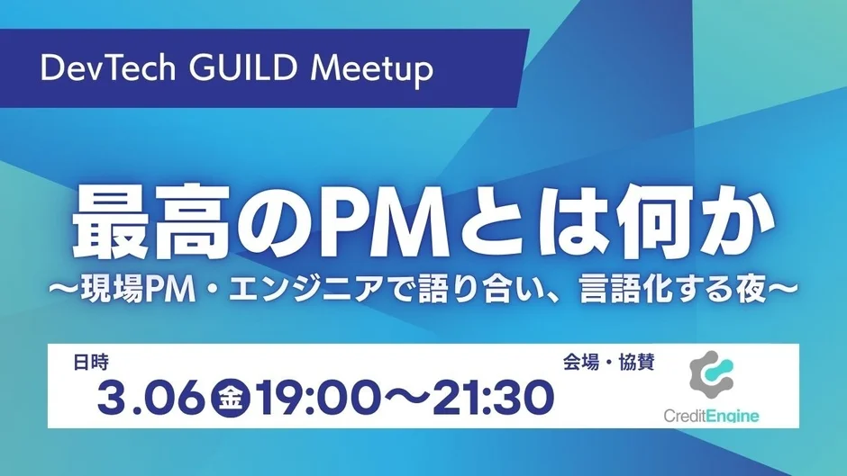 2026年3月6日(金)、東京・六本木にて、PM(プロジェクトマネージャー)とPMを目指すエンジニアを対象とした特別な勉強会「最高のPMとは何か? ― 現場PM・エンジニアで語り合い、言語化する夜」が開催されます。このイベントは、PMに特化したギルド型コミュニティ「DevTech GUILD」が初めて主催するオフラインイベントであり、クレジットエンジン株式会社が協賛しています。