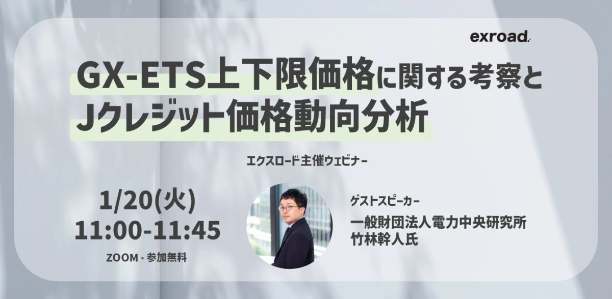 ウェビナーでは、今回示されたGX-ETS排出枠上下限価格案の考え方や、足元のJクレジット価格動向について、最新の分析結果とともに詳細な解説を提供してくださいます。