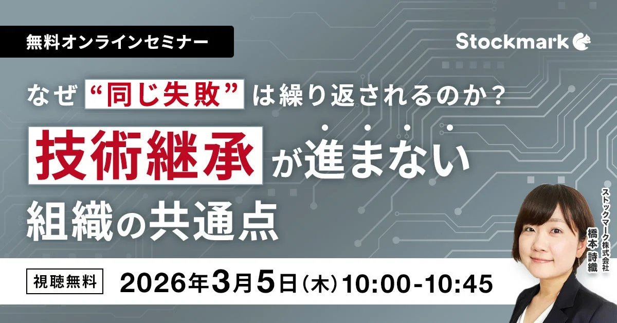 ストックマーク株式会社が開催するオンラインセミナーでは、「なぜ同じ失敗は繰り返されるのか?」という問いを起点に、技術継承が進まない組織が抱える共通の要因を具体的に整理します。