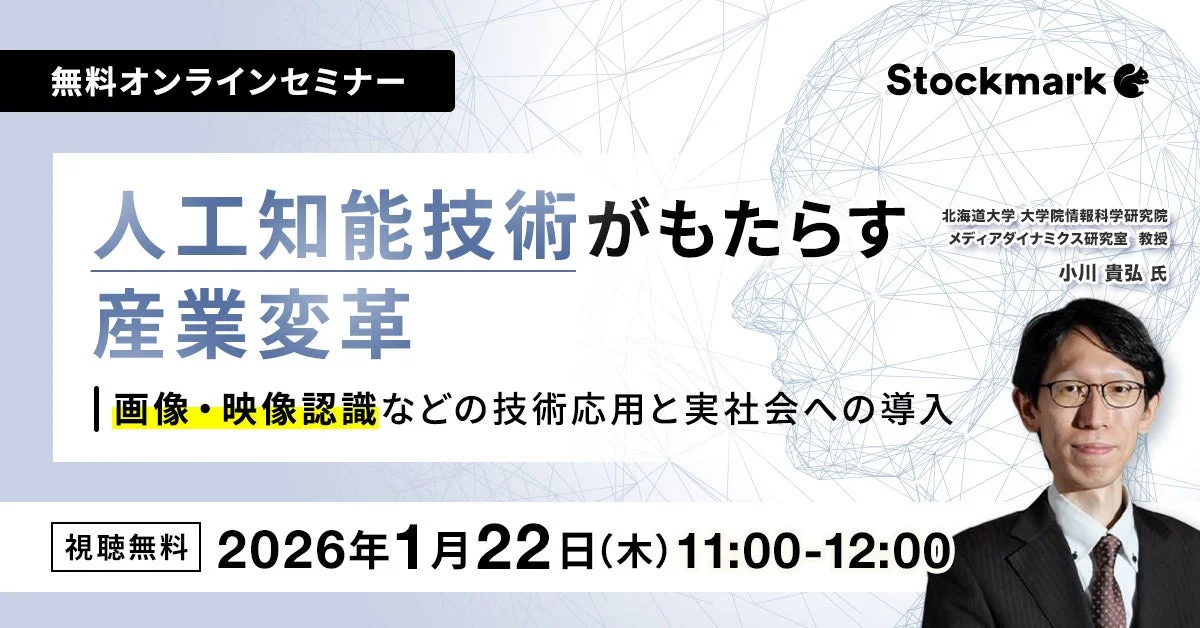 ストックマーク株式会社は、このようなAI技術の最前線と、それがどのように実社会で活用されているのかを深掘りする無料オンラインセミナーを2026年1月22日(木)に開催します。本セミナーでは、世界的に著名な北海道大学・メディアダイナミクス研究室の小川貴弘教授が登壇し、AI技術がもたらす産業変革の全体像と、具体的な応用事例について詳しく解説します。