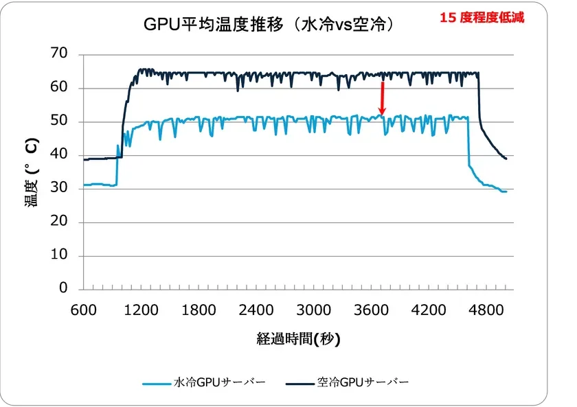 PoCでは、電力効率の向上だけでなく、水冷GPUサーバーの具体的な冷却効果も確認されました。水冷GPUサーバーと空冷GPUサーバーの性能を比較した結果、最大負荷時においてGPUの平均温度が約15度低減されることが実証されました。これは、CDU(冷却分配装置)などの冷却設備が適切に機能していることを示しています。