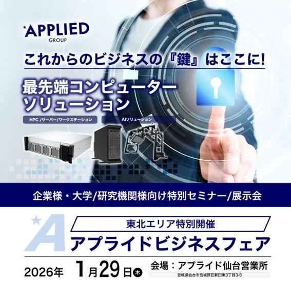 そうしたビジネスの課題を解決し、DX推進を強力にサポートするために、アプライド株式会社は2026年1月29日(木)にアプライド仙台営業所にて、「これからのビジネスの『鍵』はここに!最先端コンピューターソリューション アプライドビジネスフェア(東北エリア特別開催)」を開催します。本イベントは、法人様、個人事業主様、大学・専門学校様を対象に、最新のAI技術、ビジネスコンピューター、ワークステーション、サーバーソリューションに関する展示・商談会と、専門家による無料セミナーを通じて、具体的な解決策と活用事例を提供します。