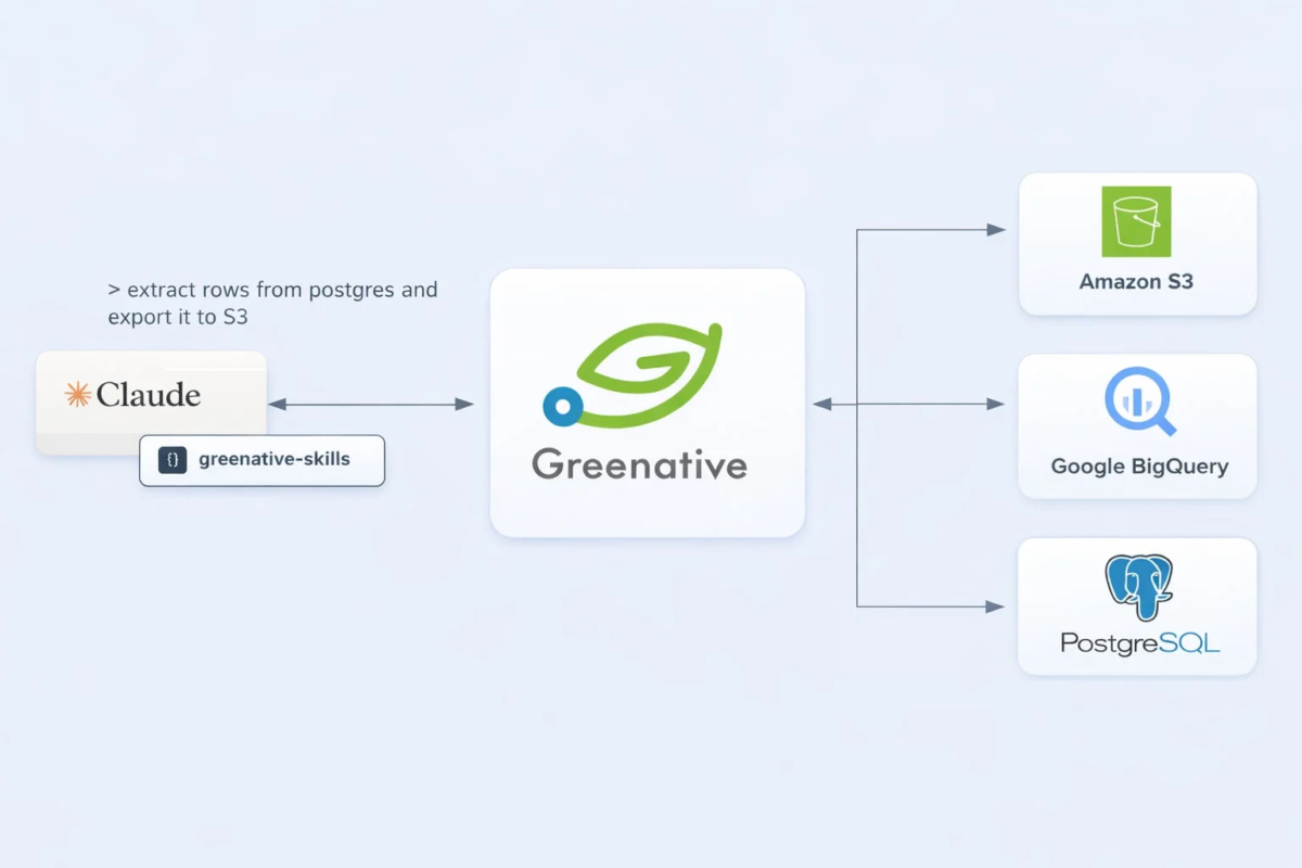 ClaudeがGreenative-skillsを介してGreenativeと連携し、PostgreSQLからデータを抽出しAmazon S3へエクスポートするデータ連携ワークフロー