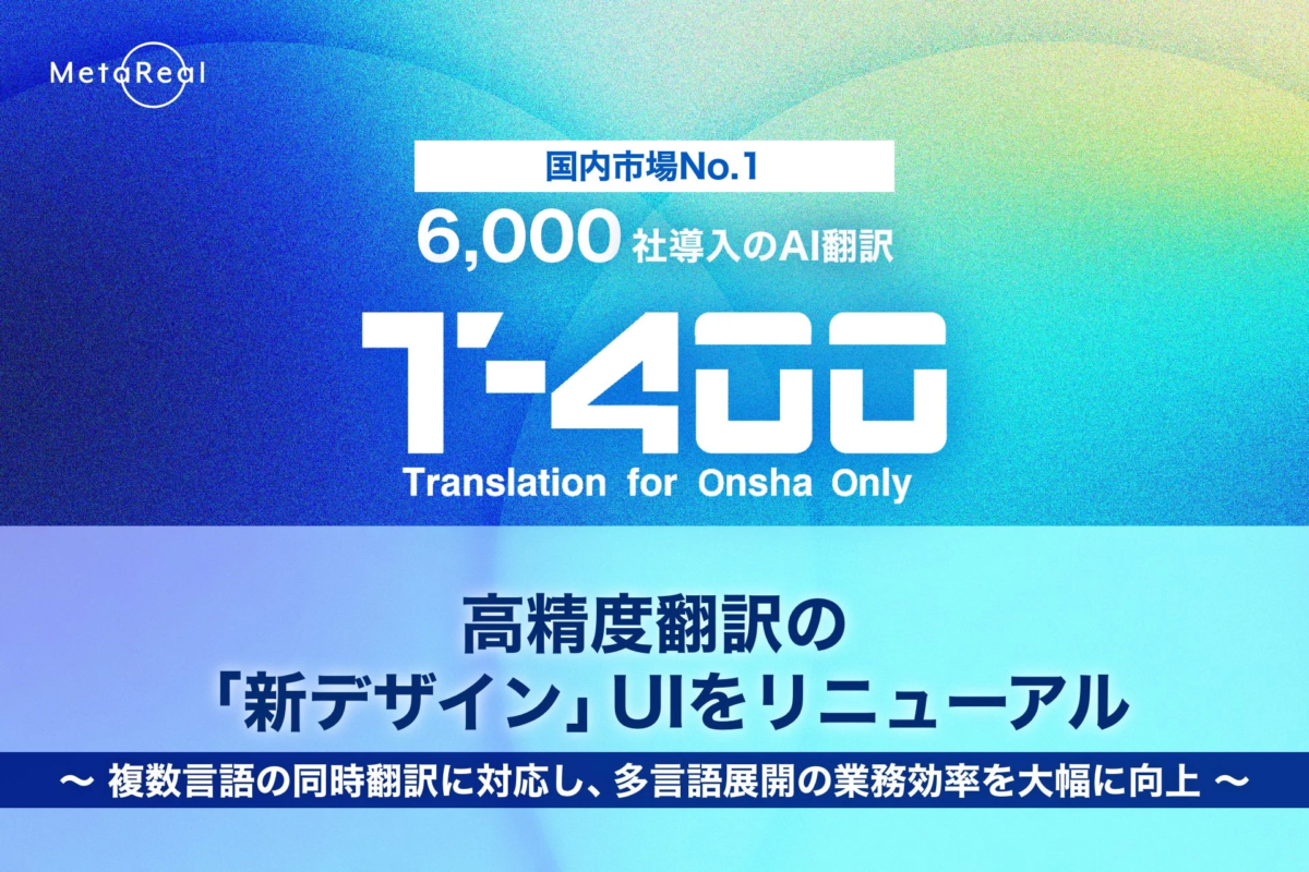 こうした課題に対し、株式会社メタリアルグループの株式会社ロゼッタが提供する高精度産業翻訳AI「T-4OO(ティーフォーオーオー)」は、国内市場でNo.1の実績※を誇り、その精度の高さで多くの企業から支持を得ています。そしてこの度、2026年1月、「T-4OO」の高精度翻訳(旧生成AI翻訳)機能において、ユーザーインターフェース(UI)の大幅なリニューアルが実施されました。