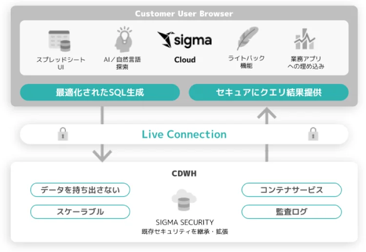 Sigma Cloudがデータウェアハウス(CDWH)とライブ接続し、最適化されたSQL生成とセキュアなクエリ結果を提供するデータ分析システム。スプレッドシートUIやAI/自然言語探索などの機能を通じ、既存セキュリティを継承・拡張し、データを持ち出さずにスケーラブルなデータ活用を実現します。