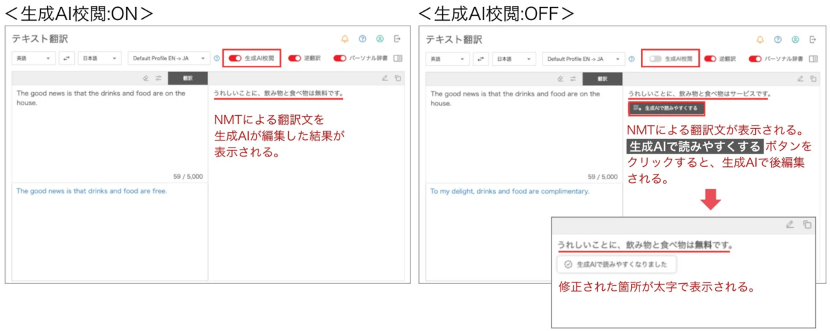 上の画像は、生成AI校閲のON/OFFによる訳文の違いと、差分可視化の様子を示しています。例えば、「The good news is that the drinks and food are on the house.」という原文に対し、NMTのみの翻訳では「うれしいことに、飲み物と食べ物は無料です。」となるかもしれません。しかし、「生成AI校閲」を適用すると、「うれしいことに、飲み物と食べ物はサービスです。」のように、より自然で適切な表現に修正され、変更箇所が太字で示されます。