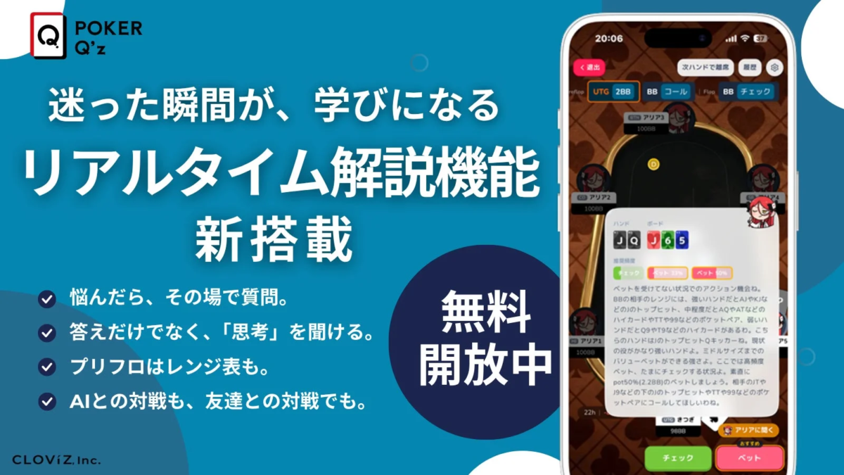 ポーカーの戦略学習に革命をもたらす、画期的な機能が誕生しました。ゲーム型ポーカー戦略学習アプリ「POKER Q’z(ポーカーキューズ)」が、対戦中にリアルタイムでAIがプレーの考え方を解説する「リアルタイム解説機能(β)」を公開しました。