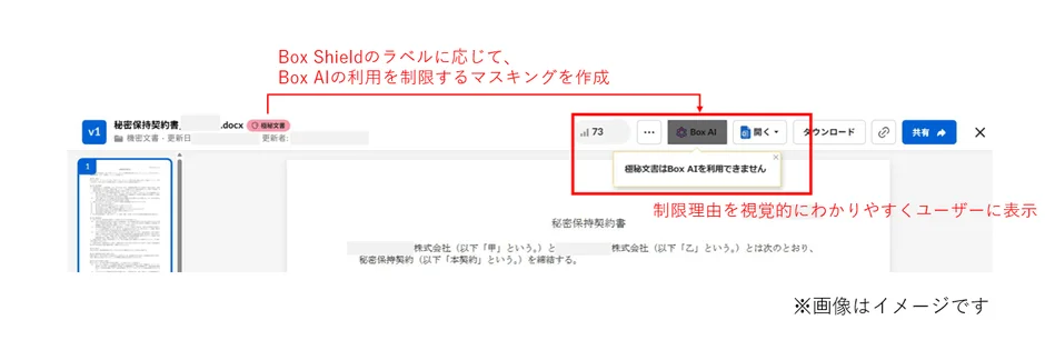 これにより、意図しない情報漏洩や、企業ポリシーに反する文書利用を未然に防止し、より安全で統制の取れた運用を実現します。利用者は、閲覧が制限されている文書に対してBox AIが利用できない旨を画面上で視覚的に確認できるため、誤操作を防ぐことにもつながります。