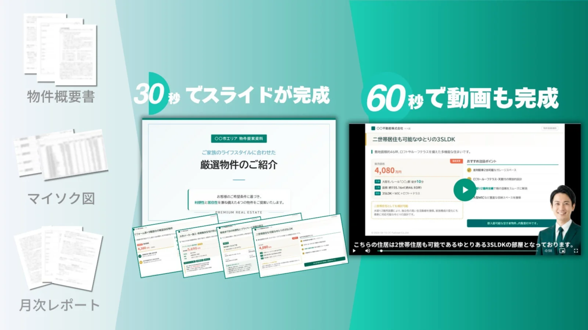 この機能の最大の特長は、スライド作成から動画化までを一つのサービスで完結できる点です。従来のように、資料作成ツールと動画制作ツールを別々に使い分け、それぞれの操作を習得する必要がなくなります。不動産業界で日々蓄積されている物件情報PDF、間取り図、物件写真、管理システムの運営データ、収支レポート、市場データ、収益シミュレーションExcel、法令文書PDFなど、あらゆる既存資料を素材として投入できるため、現場に眠る貴重な情報資産を最大限に活用し、高品質な紹介資料や提案資料、報告資料、研修資料へと展開することが可能になります。