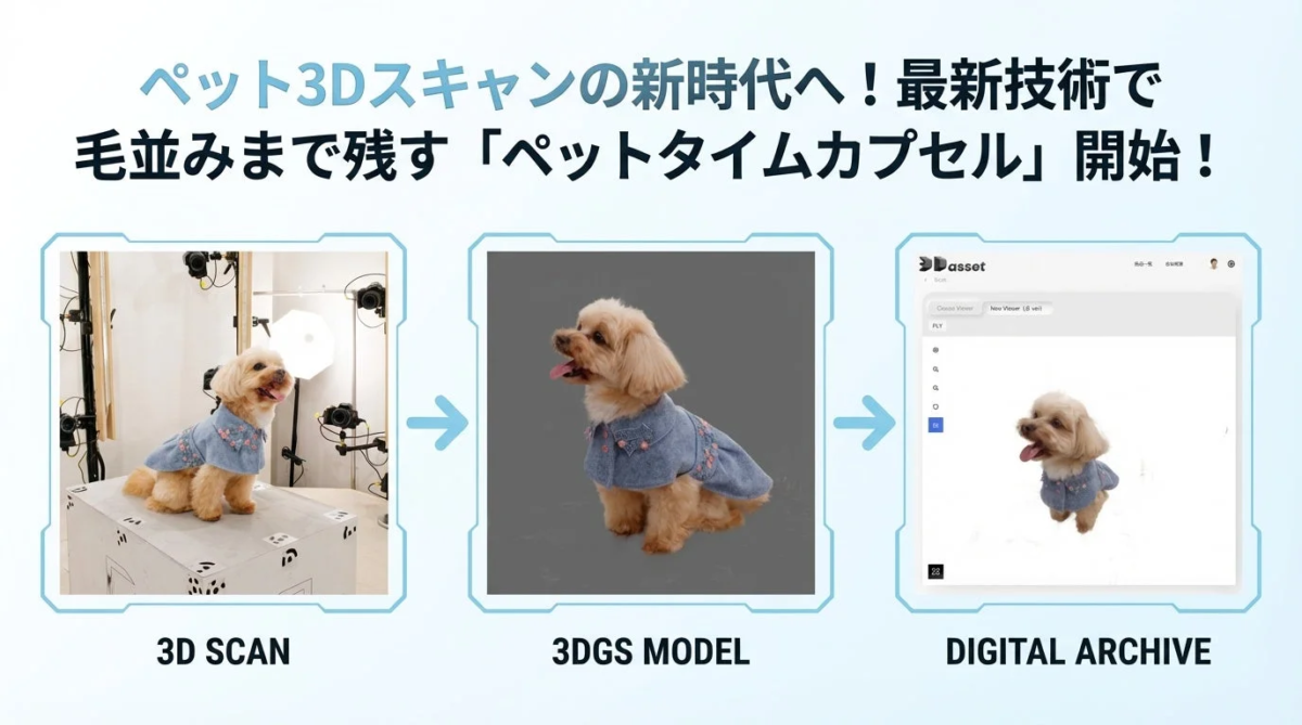 「ペットタイムカプセル」は、最新の3Dスキャン技術「3D Gaussian Splatting」と、ブロックチェーンを活用した堅牢なデータ保存プラットフォーム「3Dasset.io」の連携によって実現した、画期的なサービスです。従来の写真や動画では伝えきれなかったペットの立体的な存在感や、毛並みの質感、瞳の輝きまでをリアルに再現し、デジタルデータとして半永久的に保存します。