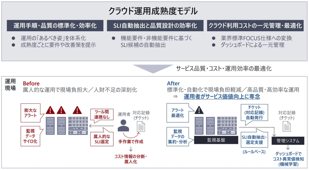 デジタルトランスフォーメーション(DX)の加速やIT活用の高度化が進むにつれて、企業にはより高品質で低コスト、そして高効率な運用体制の実現が求められています。このような背景から、現場の負担を軽減しつつ、持続的に運用を最適化できる新しいクラウド運用モデルの開発が強く求められていました。
