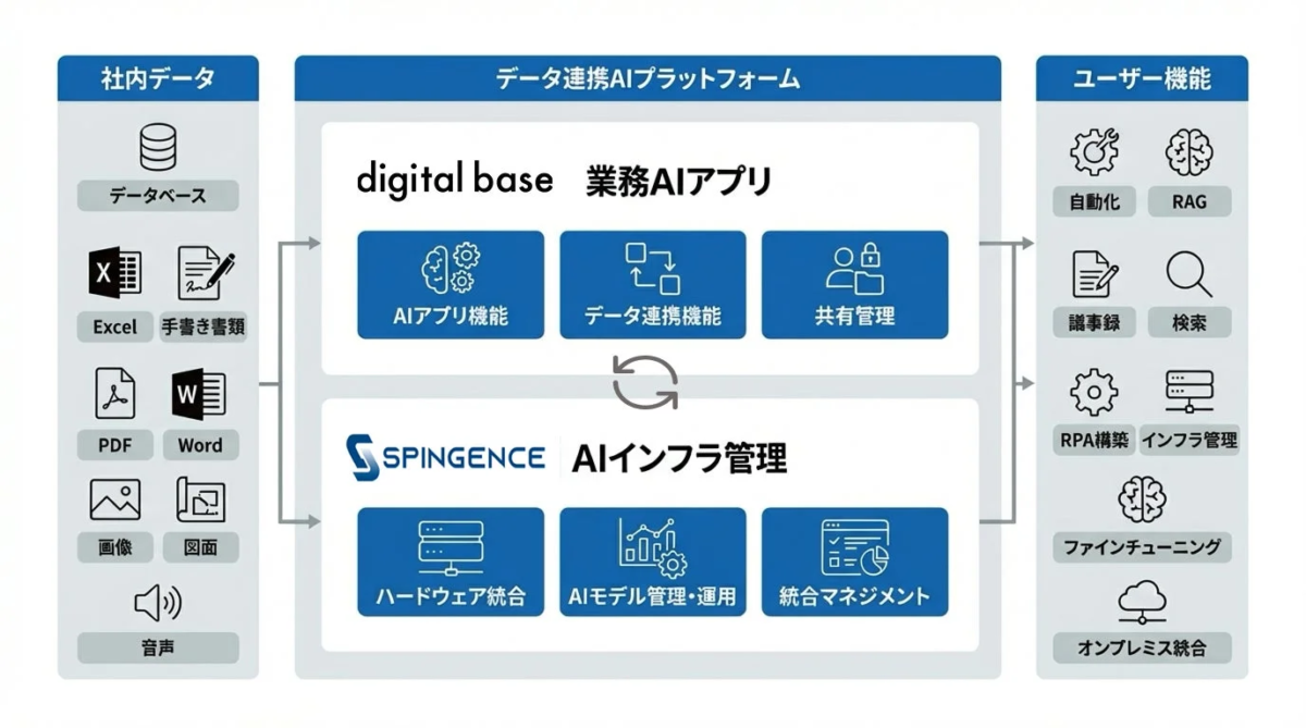 デジタルベースとSpingenceは、これらの背景を踏まえ、それぞれの強みを活かして社内データ連携AIプラットフォームを共同開発しました。このプラットフォームは、企業が社内環境で安全かつ容易にAIを構築・運用できることを目指しています。
