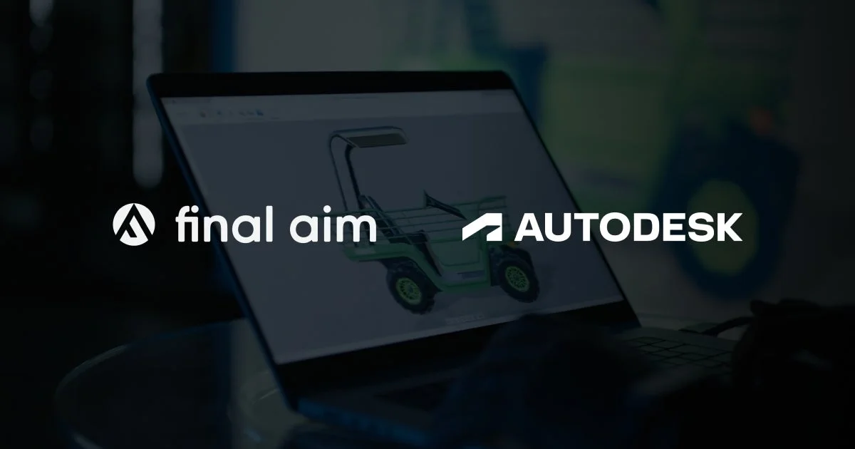ラップトップの画面に緑色の車両の3Dモデルが表示されており、「final aim」と「AUTODESK」のロゴが重ねて配置されています。これは、両社のコラボレーションやデザインソフトウェアの使用を示唆する画像です。
