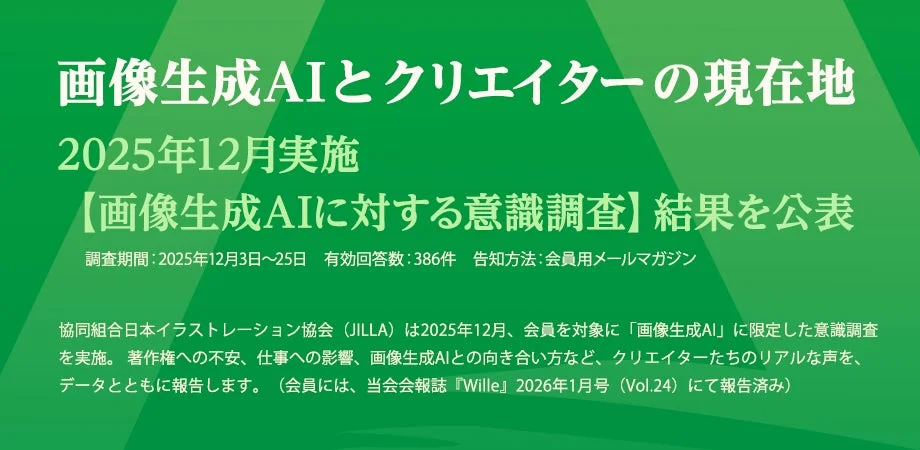 協同組合日本イラストレーション協会(JILLA)は、2025年12月に会員のクリエイターを対象に「画像生成AI」に特化した意識調査を実施しました。この調査は、著作権侵害のリスク、クライアントとの取引上のトラブル、そしてクリエイターとしての評価への影響といった、現場で実際に起きている具体的な課題を明らかにする目的で行われました。