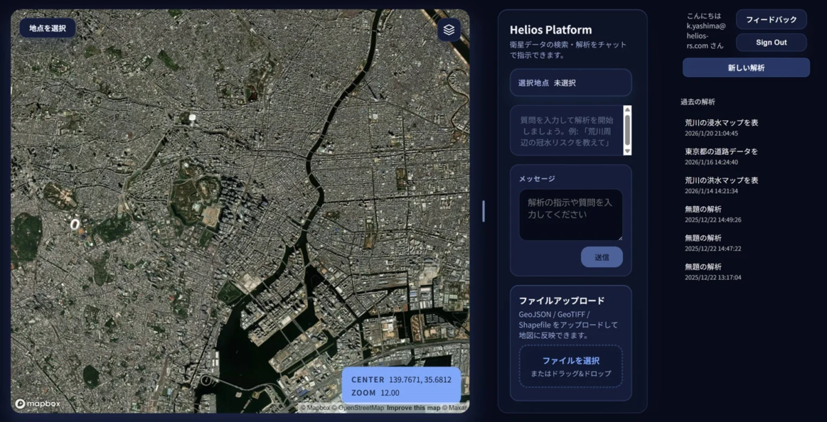 「Helios Platform」は、ユーザーが知りたいことをチャット形式で入力するだけで、AIが衛星データや様々な地理空間情報を解析し、結果を地図上に視覚的に表示してくれるサービスです。