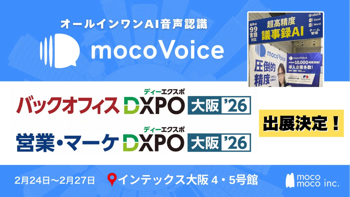 mocomoco株式会社が開発したオールインワンAI音声認識「mocoVoice」は、まるで秘書がいるかのように、会議の内容を正確に書き起こし、自動で議事録を作成してくれる画期的なサービスです。この「mocoVoice」が、2026年2月24日(火)から27日(金)までインテックス大阪で開催される「バックオフィスDXPO 大阪’26」と「営業・マーケDXPO 大阪’26」に登場します。