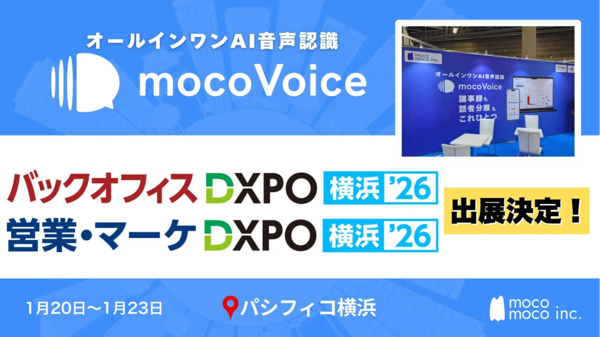 mocomoco株式会社は、オールインワンAI音声認識サービス「mocoVoice」を、2026年1月20日(火)から23日(金)までパシフィコ横浜で開催される「バックオフィスDXPO 横浜’26」および「営業・マーケDXPO 横浜’26」に出展することを発表しました。この展示会では、「mocoVoice」の持つ高精度な書き起こし、AI校正、議事録作成、話者名推定といった最先端の機能を、実際にその場で体験することができます。