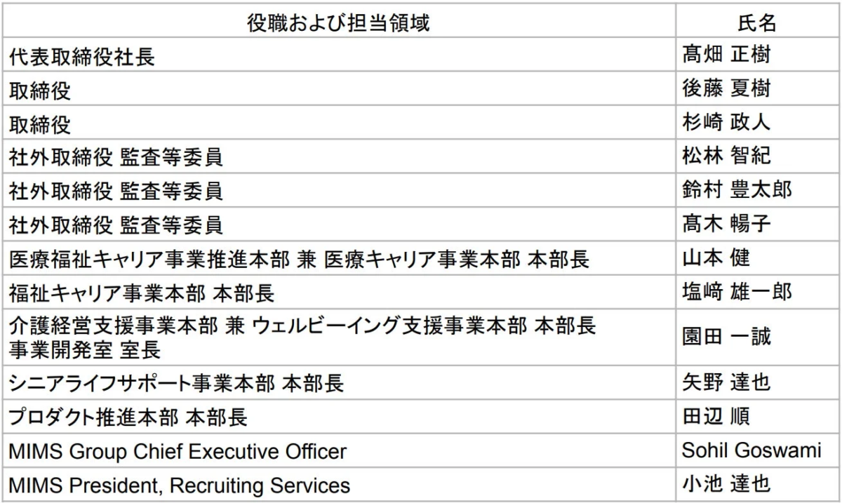 エス・エム・エスは、新たな代表取締役社長である髙畑氏のもと、経験豊富な役員および各本部長で構成される強力な経営陣を擁しています。この新体制は、同社が掲げるミッションを達成し、高齢社会における多様な課題解決に貢献するための重要な基盤となります。