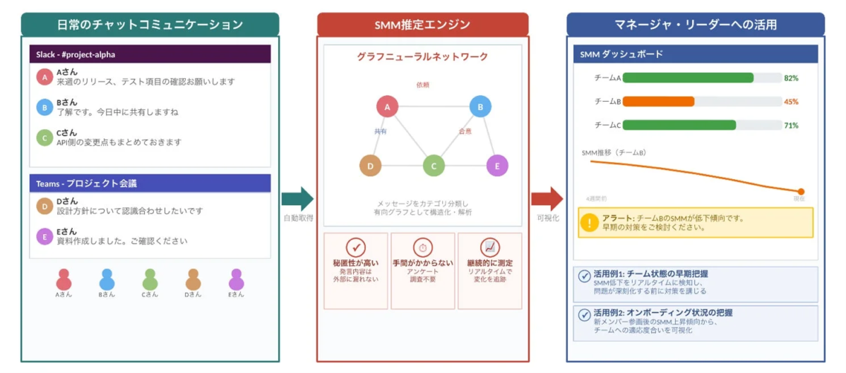 この技術は、SMMの低下を早期に検知し、適切なタイミングで対策を講じることで、チームの生産性向上に直結します。また、新メンバーのオンボーディング状況を可視化することで、チームへのスムーズな適応をサポートし、組織全体の活性化にも貢献するでしょう。