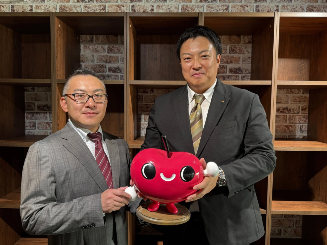 スーツの男性2人とリンゴのキャラクター
