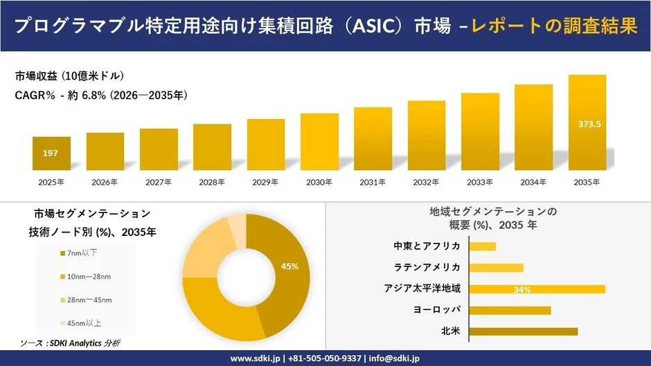 SDKI Analyticsの調査結果が示すように、プログラマブルASIC市場は今後も力強い成長が予測されています。2025年には約197億米ドルの市場規模でしたが、2035年には約373.5億米ドルに達する見込みです。この成長を牽引する主な要因は以下の通りです。