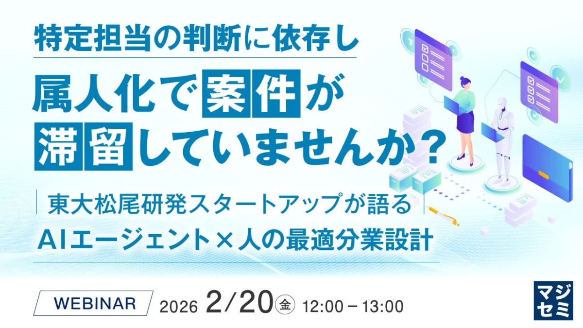 このような状況を打開するための強力なソリューションとして、今注目を集めているのが「AIエージェント」です。マジセミ株式会社は、株式会社テンダと東大松尾研発スタートアップである株式会社AImondoの共催により、「特定担当の判断に依存し、属人化で案件が滞留していませんか?」というテーマのウェビナーを開催します。このウェビナーでは、AIエージェントを活用して、いかに業務の属人化を解消し、効率的な「人」と「AI」の分業体制を築くかについて、AI初心者にも分かりやすく詳しく解説されます。