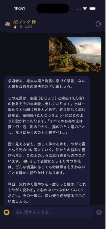 テキストでの悩み相談に加え、写真を送るとAIが画像の内容を読み取り、仏教の教えと結びつけて応答する機能も搭載しています。