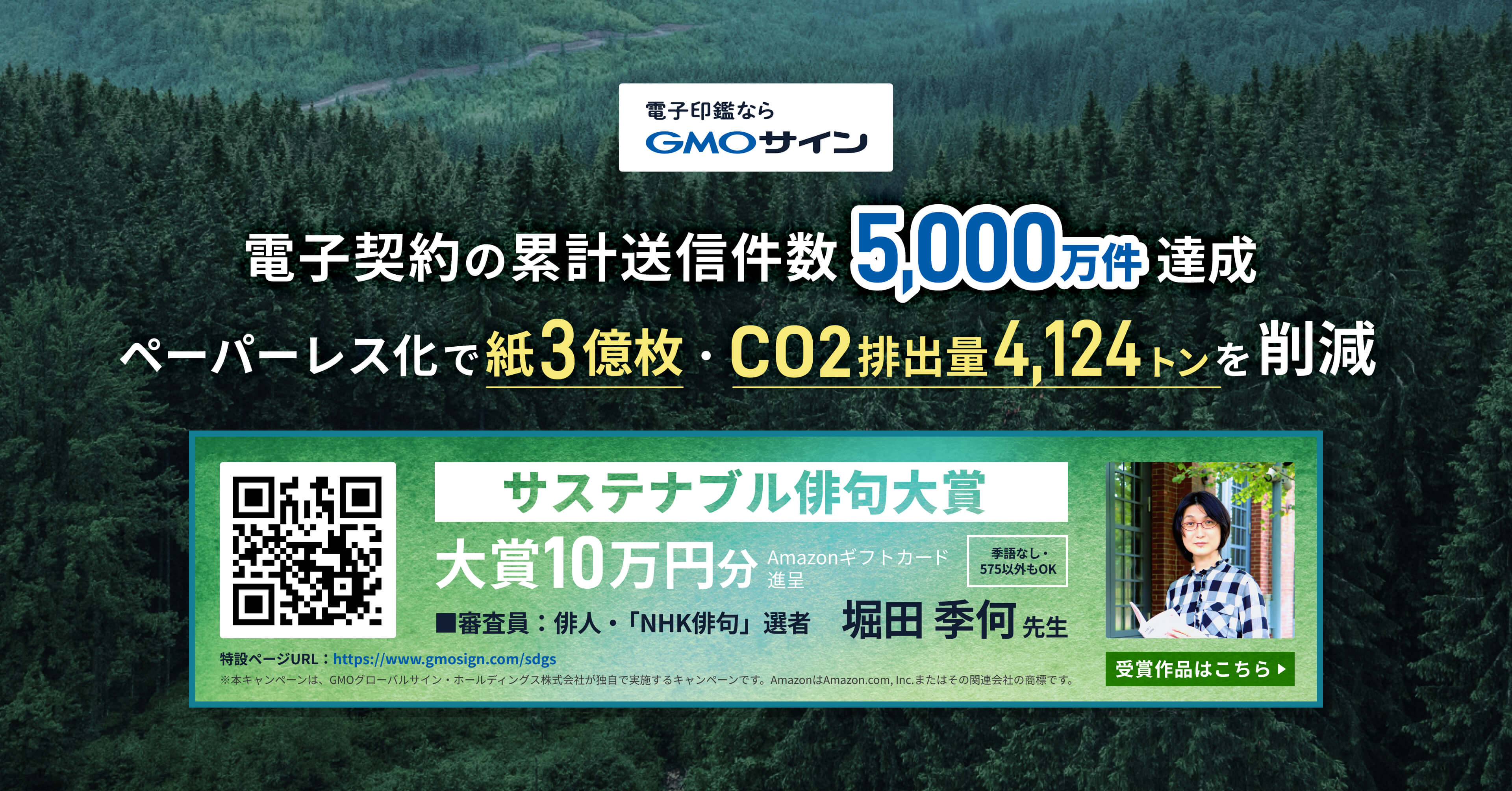 「GMOサイン・サステナブル俳句大賞」は、GMOグローバルサイン・ホールディングスが開発・提供する電子署名サービス「GMOサイン」が主催した俳句コンテストです。このサービスは、業務効率化やペーパーレス化を通じて、企業や自治体のSDGs(持続可能な開発目標)達成とESG経営をサポートしています。このコンテストは、サステナブル(持続可能)な社会づくりへの関心を高めることを目的とし、大人から子供まで誰でも参加できる、SDGs・ESGをテーマにした俳句を募集しました。