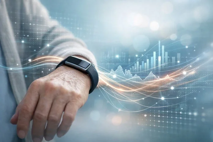 高齢者の腕にフィットネストラッカーが装着され、その背後には健康データや市場トレンドを示すようなデジタルグラフと光の線が広がる抽象的な空間が描かれています。これは、ウェアラブルデバイスによる健康管理やデータ分析、そして未来のテクノロジーと生活の融合を象徴するイメージです。