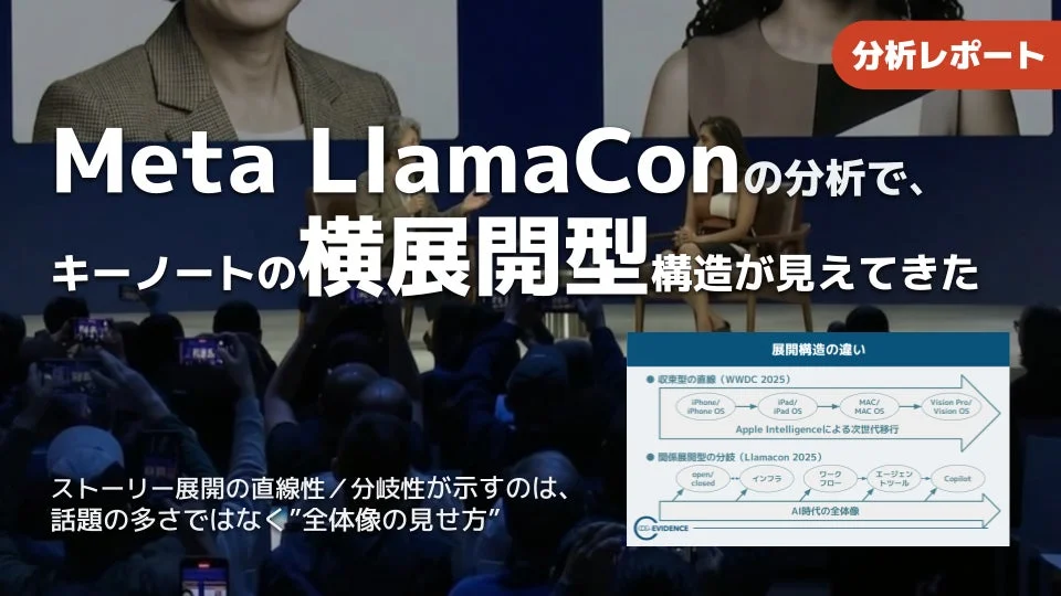 Meta LlamaCon 2025のキーノート分析は、AI時代におけるプレゼンテーションの「伝え方」に新たな光を当てました。ストーリーの分岐が、単なる話題の多さではなく、複数の関係要素を横に展開し、全体像として理解させるための戦略的な設計であることを示した今回の分析は、企業が複雑な情報を効果的に伝えるための貴重な知見となります。