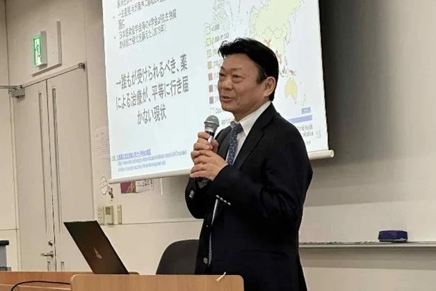 スーツ姿の男性がマイクを持ってプレゼンテーションを行っています。背後のスクリーンには、薬による治療の現状に関する日本語のテキストと地図が表示されています。