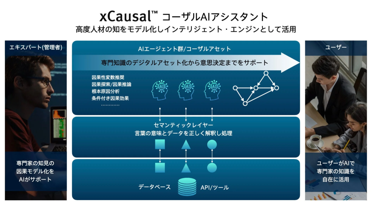 「コーザルAIアシスタント」は、企業や組織内の専門家や熟練者の知識・判断プロセスを、因果関係に基づいたモデルとして整理し、組織内の誰もが活用できる形で提供するAIアシスタントです。