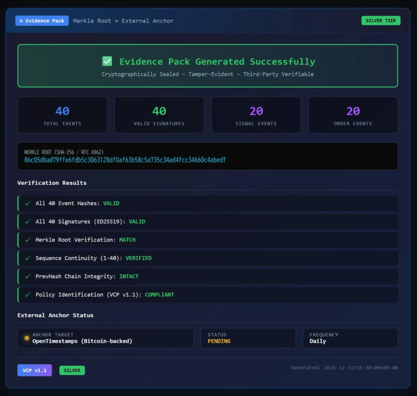 VSOは、VCP v1.1の仕様公開と同時に、MetaTrader 5(MT5)の本番環境で稼働するVCPのプロダクション水準実装を示すオープンソースのエビデンスパックを公開しました。
