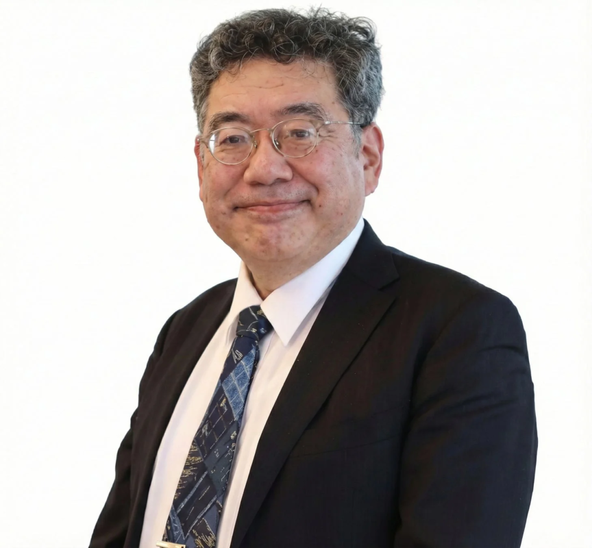 白背景の前で笑顔で立つ、眼鏡をかけたアジア系の男性のポートレートです。黒いスーツと柄物のネクタイを着用しており、プロフェッショナルな印象を与えます。
