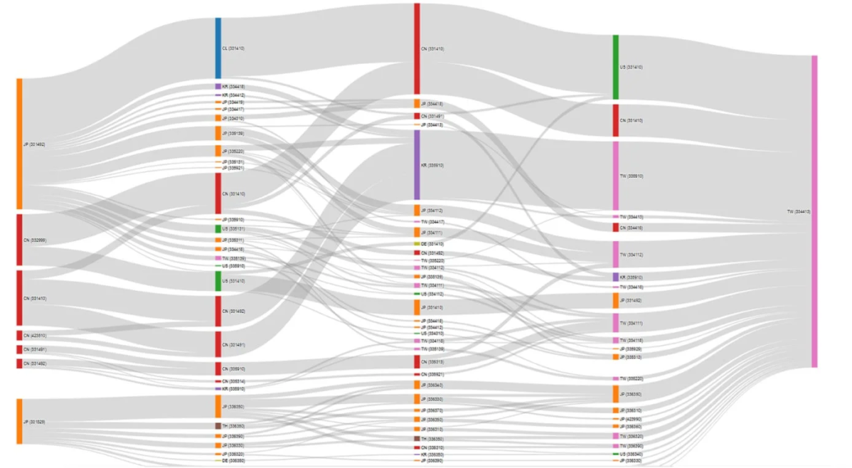 この新技術によって、サプライチェーン上の経路スコアに応じて線の太さを変えた図で、依存関係を定量的に表現できるようになります。下の画像は、データフローを示すサンキーダイアグラムであり、灰色の帯の幅がデータの量を表し、異なる色の棒が接続の開始点と終了点を示しています。このように、複雑なデータを視覚的に理解しやすくする工夫も盛り込まれています。