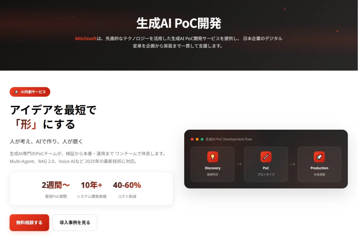 このような企業の課題を解決するため、Miichisoftは2026年1月28日より「生成AI PoC開発サービス」の提供を正式に開始しました。このサービスは、企業が実運用における生成AIのアイデアを迅速に検証し、市場価格と比較して40〜60%のコスト削減を実現することを目指しています。