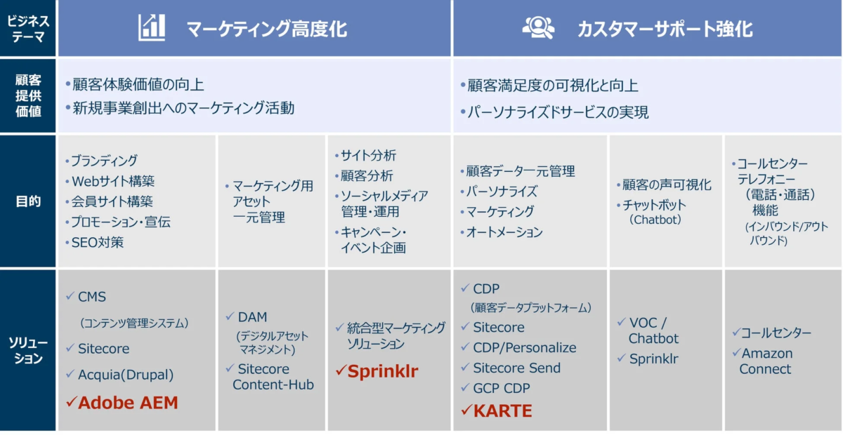 また、近年では「生成AI」の普及が目覚ましく、マーケティングの戦略立案から実際の運用、そして顧客一人ひとりに合わせたパーソナライズまでを一貫して実現するソリューションへの期待が高まっています。企業は、こうしたテクノロジーを駆使した「MarTech(Marketing Technology:マーケティングに関するテクノロジー)」基盤の整備を急速に進める必要があるのです。
