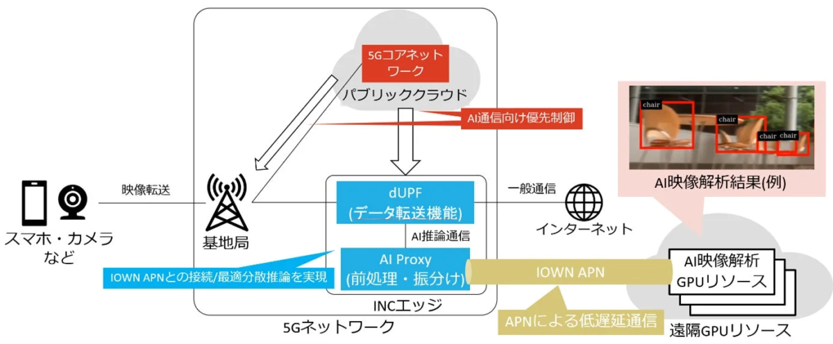 2. INCエッジでの処理: 5Gコアネットワーク上に実装された「INCエッジ」が重要な役割を果たします。INCエッジは、5GネットワークとIOWN APNを接続する機能に加え、AI推論処理をネットワーク側から制御する機能を持っています。